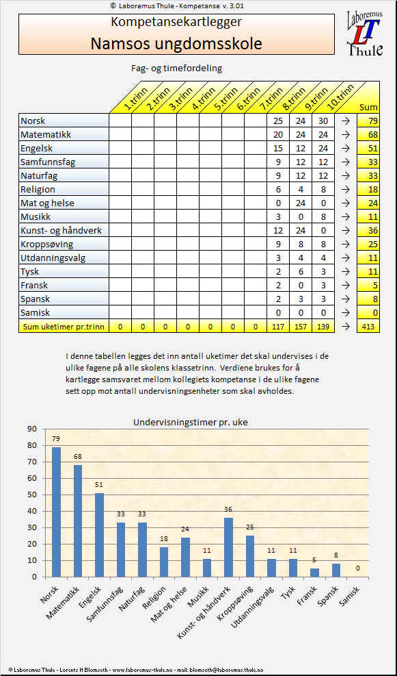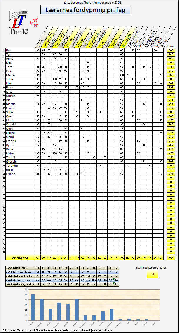 Lærere med navn og fagenheter, samt studiepoengene i de ulike fag